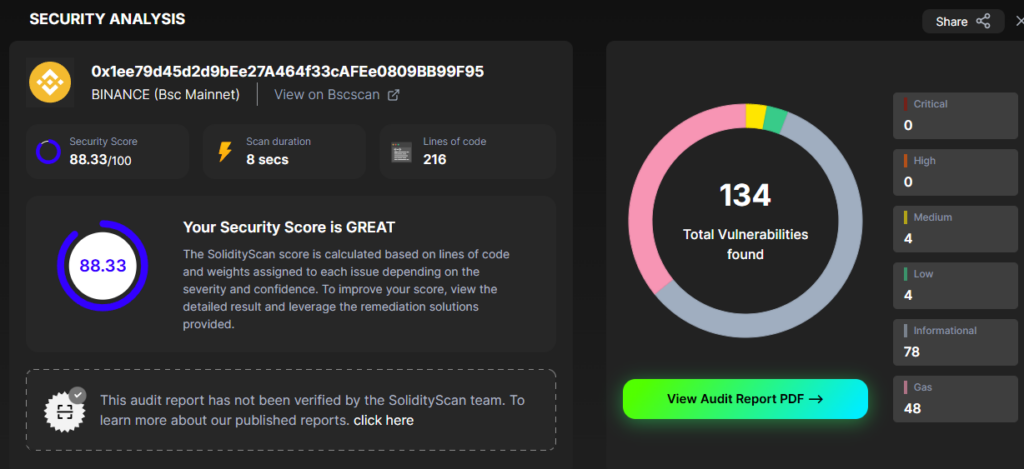 Our smart contract has undergone an automated deep-scan analysis by SolidityScan to ensure the safety of investor funds and the integrity of the MERIT ecosystem. The scan evaluated over 160+ vulnerability patterns, including reentrancy, access control, and gas efficiency.